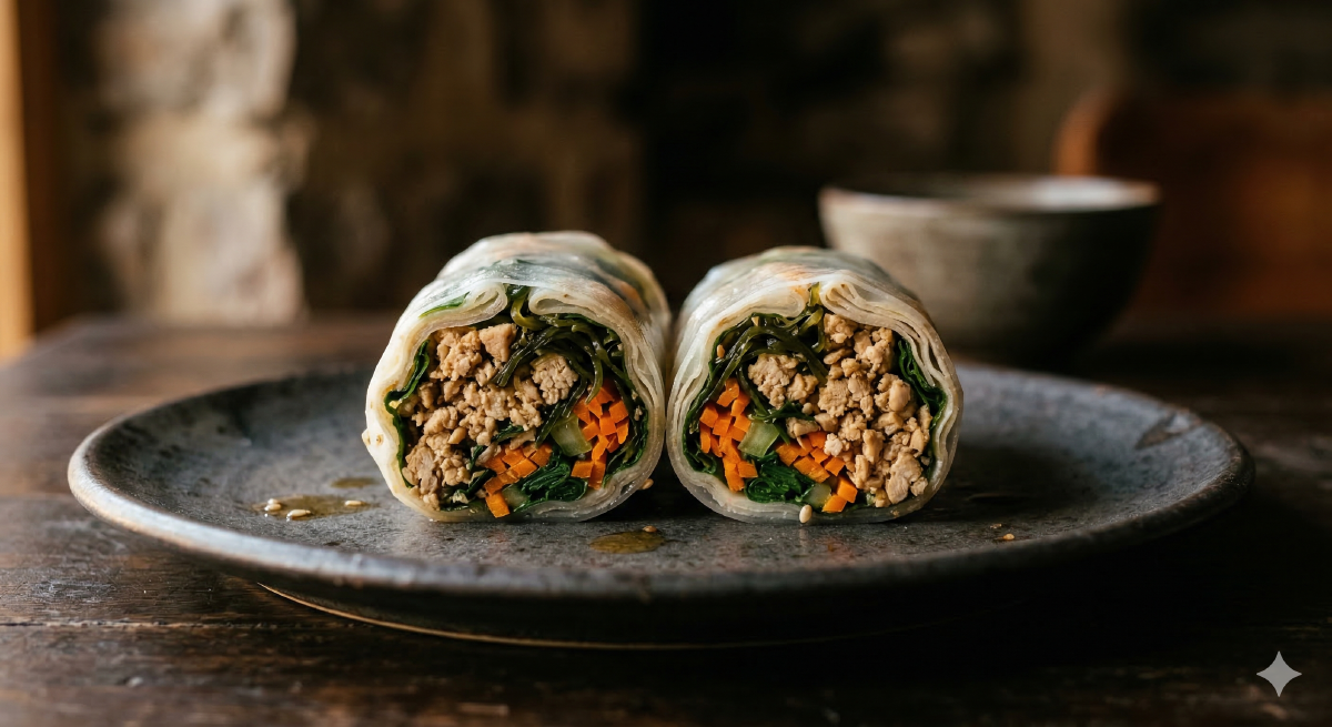 Separate the filling from the assembly. Rice paper goes soggy within hours of rolling. The filling keeps four days in the fridge. Roll fresh each time and you get a meal that tastes like you just made it, because you did — the 90-second part, anyway.